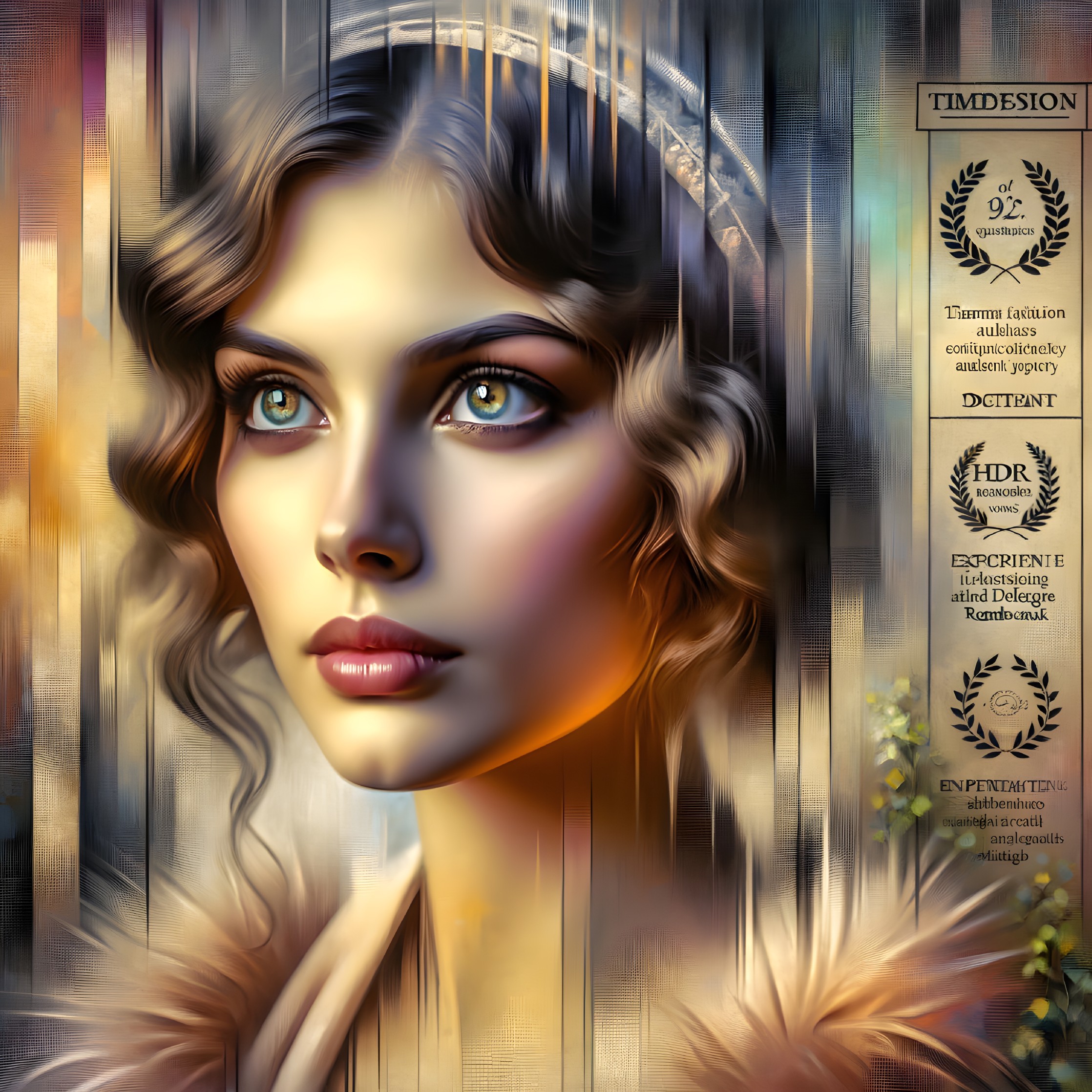 A stunning, ethereal portrait of a young woman with flowing hair and captivating eyes, surrounded by soft colors and abstract textures, exuding a timeless elegance and artistry.