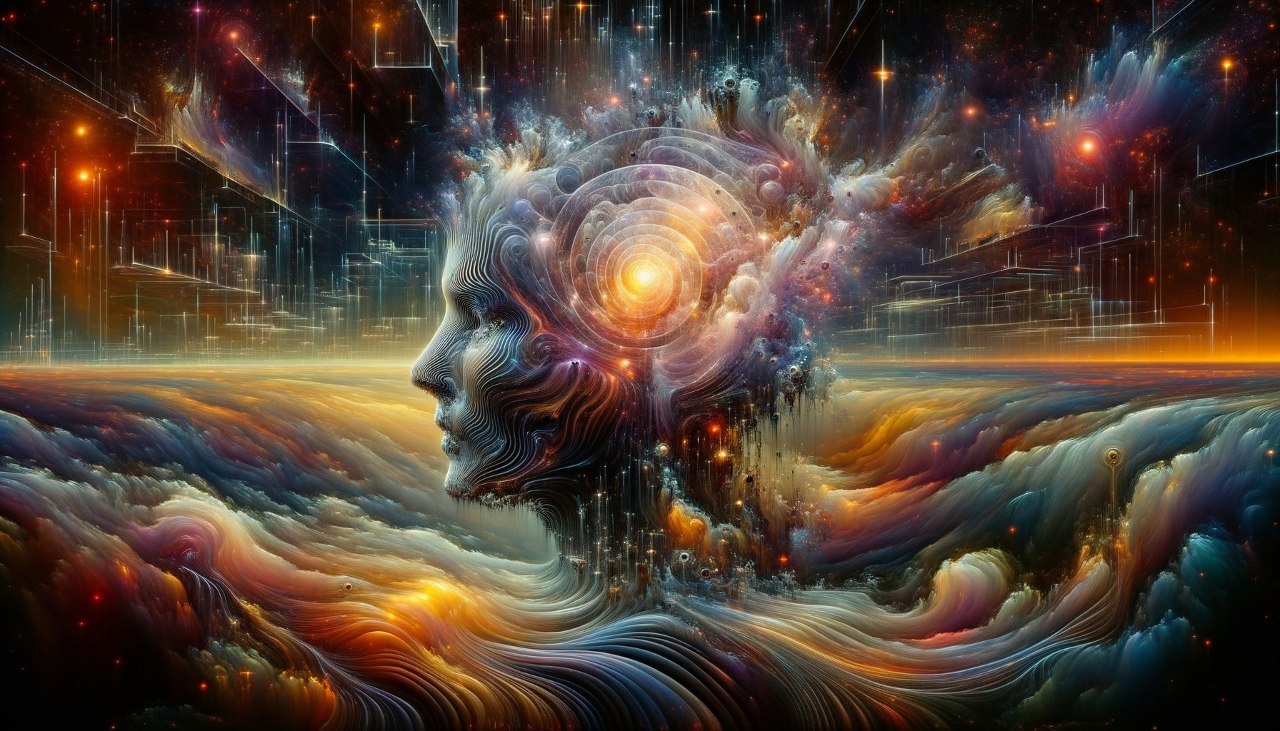 Prompt: "Dive into the image of consciousness, where thoughts ripple through the fabric of existence. In this ethereal realm, whispers of divine wisdom guide the dance of the mind. Each idea, a brushstroke on the canvas of reality, paints a portrait of awakening. Shadows of fear dissolve in the luminous glow of understanding. The journey unfolds in harmonious synchrony with the symphony of universal truths. Threads of forgiveness weave through the narrative, creating a mosaic of compassion and grace. Landscape of self-discovery, where the ordinary transforms into the extraordinary, revealing the radiant core of your being, surrealcore, Uhd"