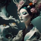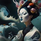 The image features a surreal portrait of a woman adorned with flowers and flowing elements, exuding a mystical aura, with intricate details and ethereal colors that evoke a dreamlike atmosphere.