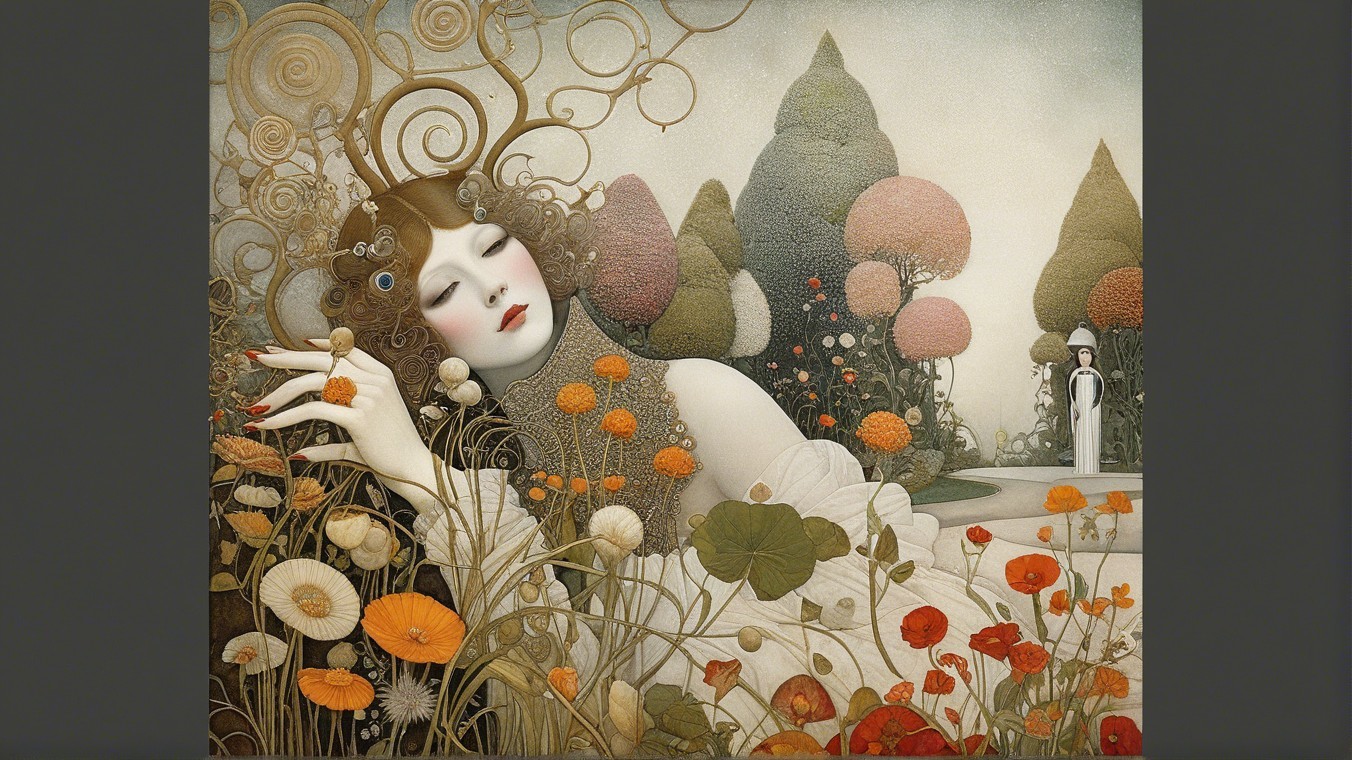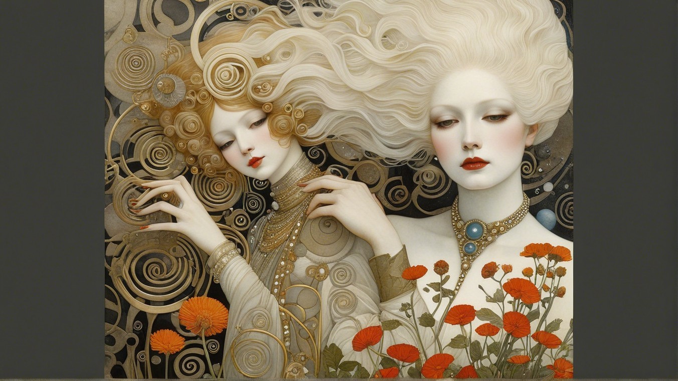 A stylized portrait of a woman with flowing hair, adorned with circular gold patterns and a central black gemstone. Her serene expression features striking eyes and elegant, intricate details.
