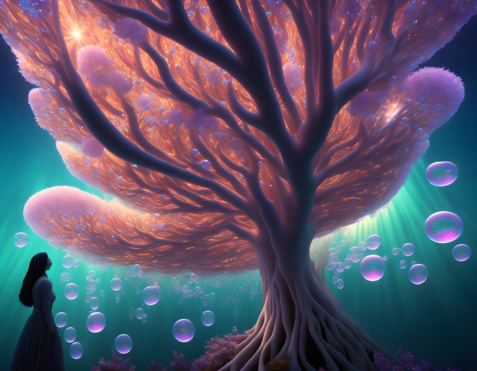 Myriads of human souls, like bubbles, float from the depths through the water mass to their source in the form of a giant glowing Tree of Life on the surface for ascension