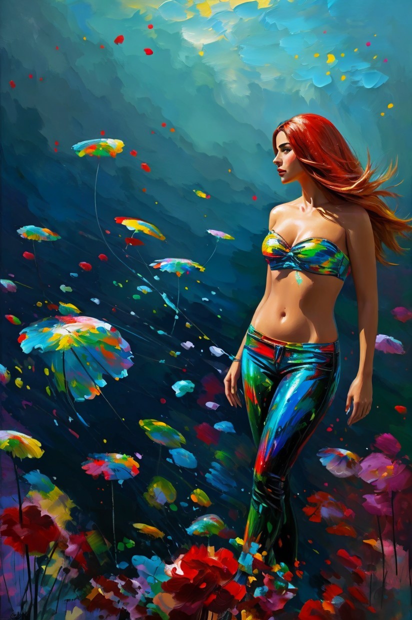 A vibrant painting of a woman walking with a colorful abstract background, dressed in a multicolored outfit, exuding confidence and grace.