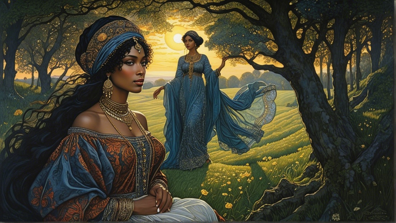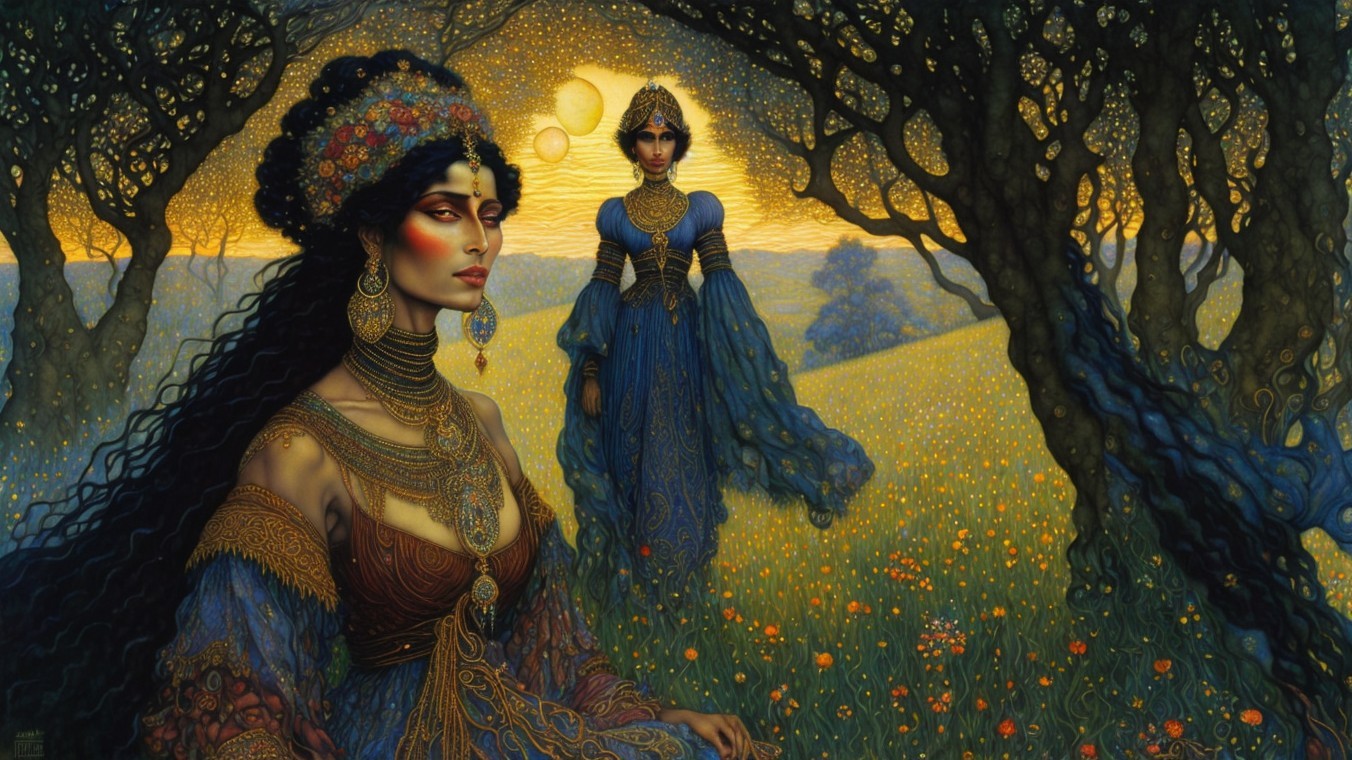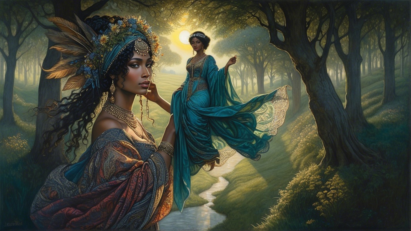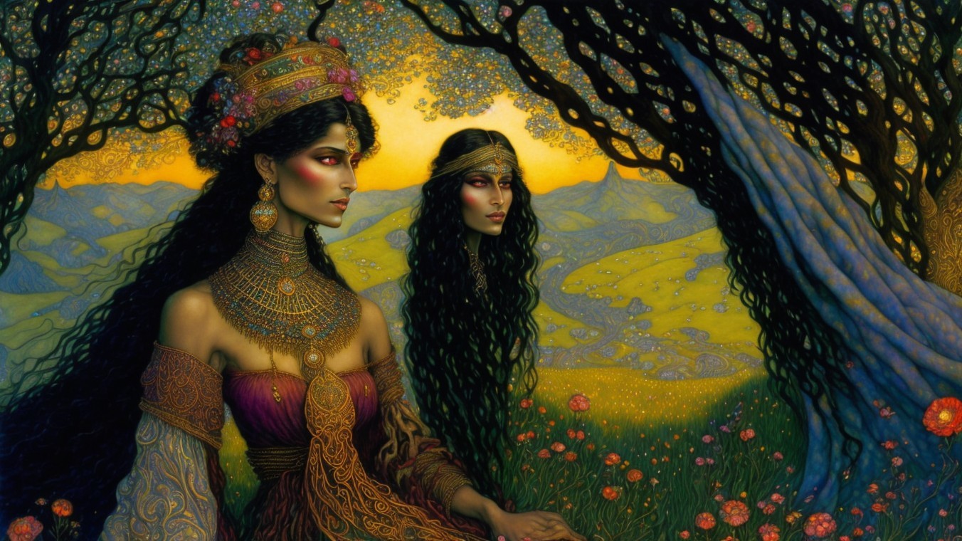 The image features two women in intricate, colorful attire, adorned with jewelry, seated in a serene, sunlit landscape. Rolling hills and trees create a tranquil backdrop, enhancing their beauty.