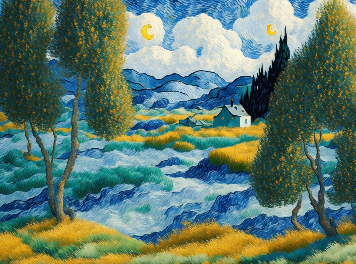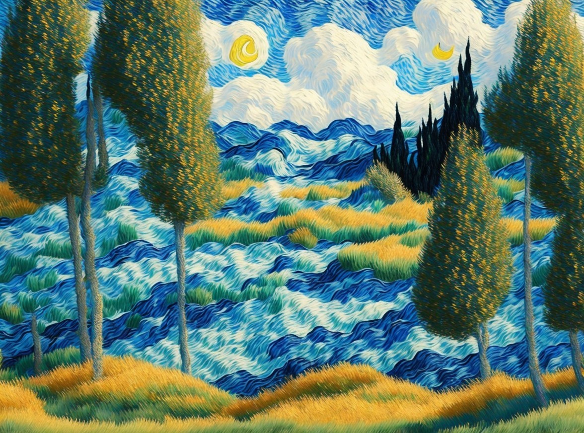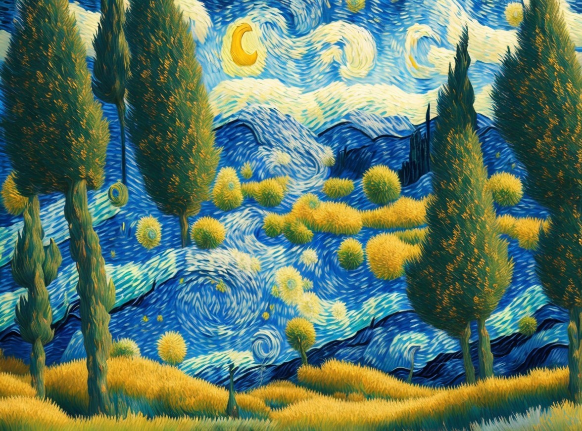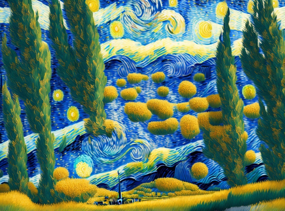 Colorful 3D rendition of swirling night sky with cypress trees and town
