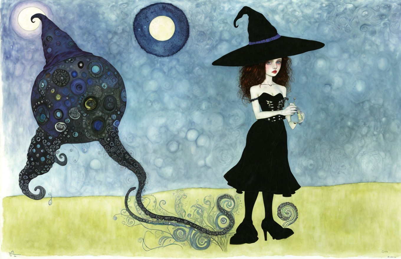 Prompt: beautiful witch with large black hat and leather strapped boots, blue textured fleshy octopus-monster with large eyes, by Egon Schiele, Paul Klee mixed media, metallic inks by Gustav Klimt , background is astronomy photo like cosmic nighsky with aurora borealis