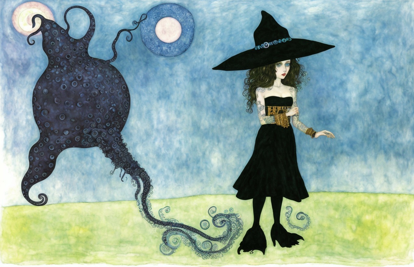 + Prompt:beautiful witch with large black hat, blue textured fleshy tentacle-monster wigh large eyes, by Egon Schiele, Paul Klee mixed media, metallic inks by Gustav Klimt