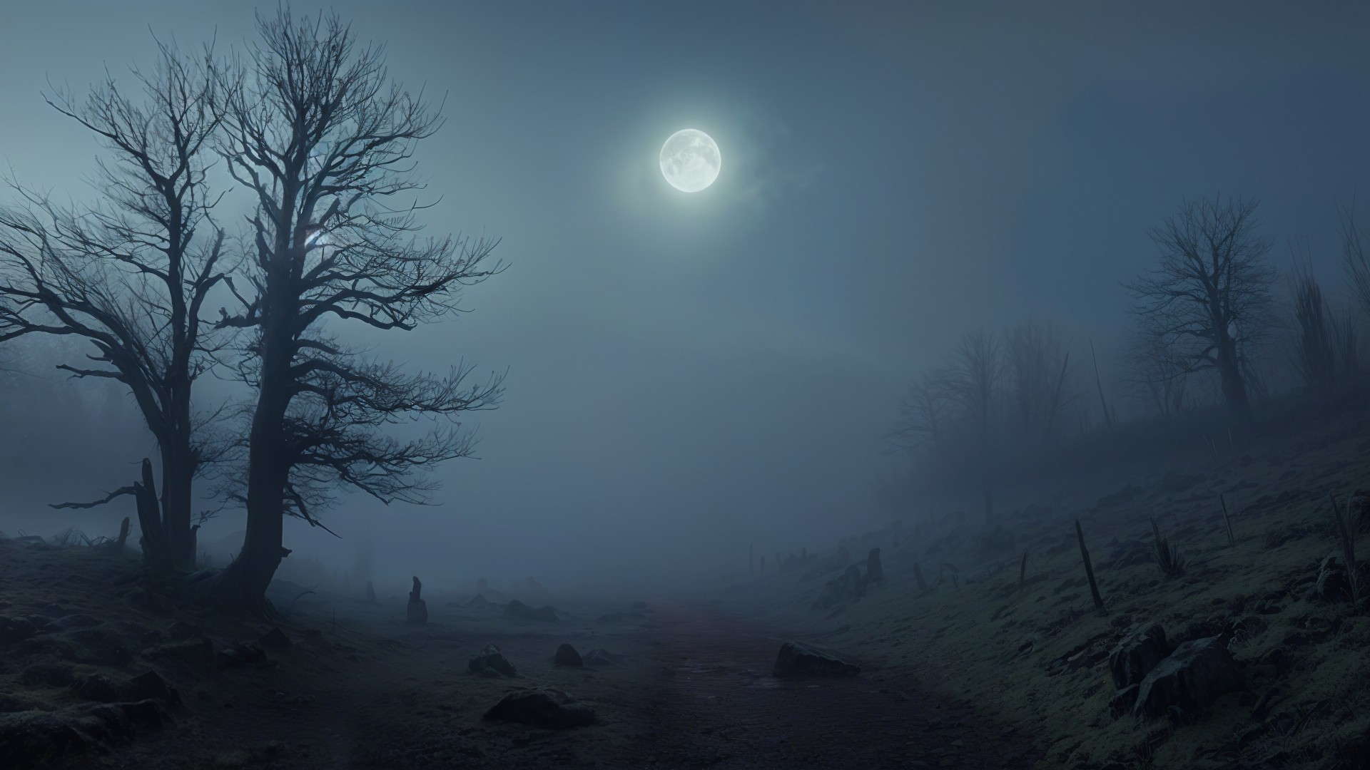 (Try from Stanislav Kozenko) - A haunting landscape features a gnarled tree silhouetted against a full moon, surrounded by fog and rocky terrain. Dark clouds swirl above, creating a mysterious, eerie atmosphere.