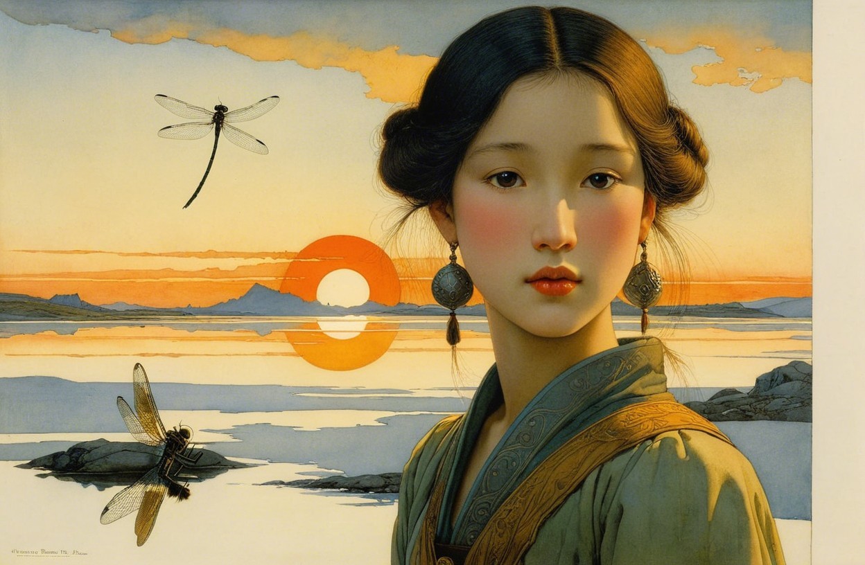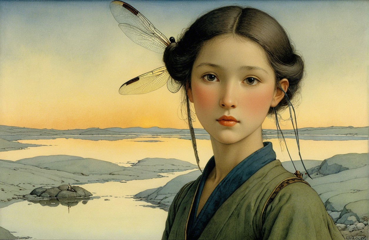 A serene portrait of a young girl with delicate features and dark hair styled in rolls, adorned with dragonfly accents. She gazes softly against a tranquil landscape with water and clouds.