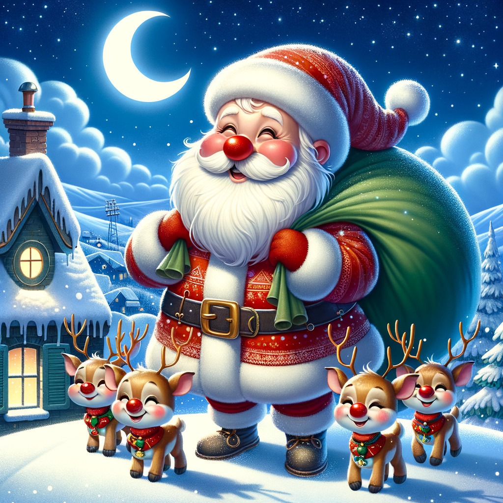 A cheerful Santa Claus with a fluffy white beard smiles, carrying festive gifts. Two reindeer are playfully perched on his shoulders, surrounded by a vibrant green background.