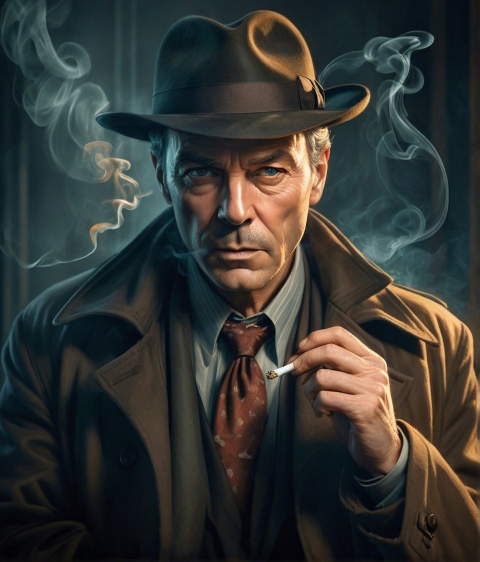 A stern man in a fedora and a brown coat smokes a cigarette, exuding an aura of mystery. Wisps of smoke curl around him, highlighting his intense gaze and vintage attire.
