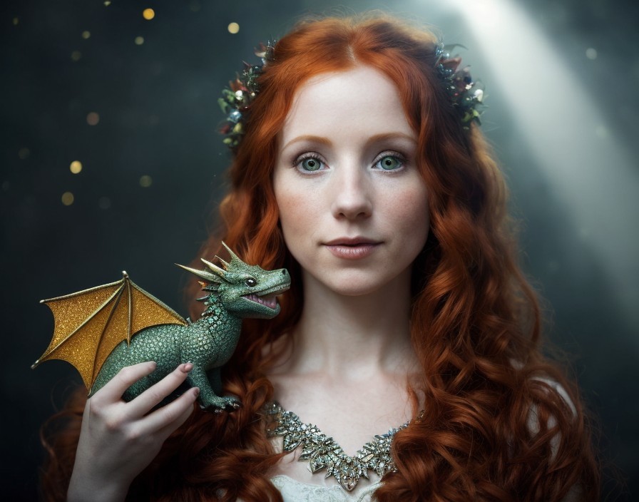 A woman with red hair and a green dragon figurine, surrounded by a mystical ambiance with sparkles and a beam of light.