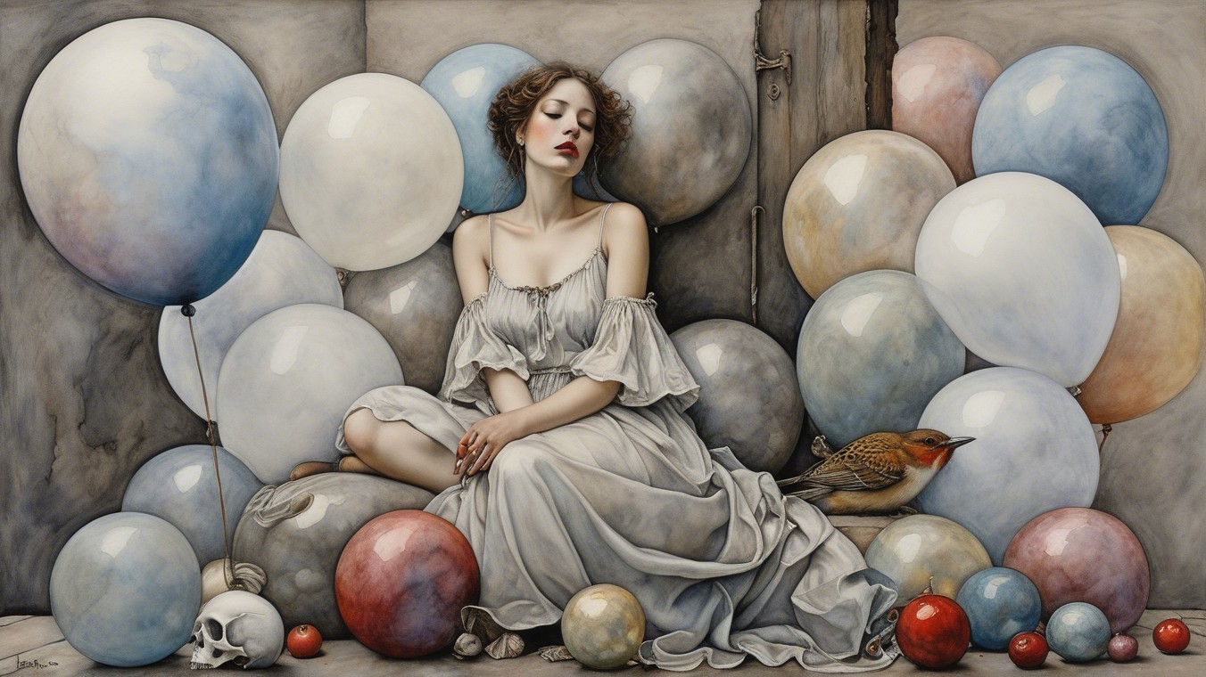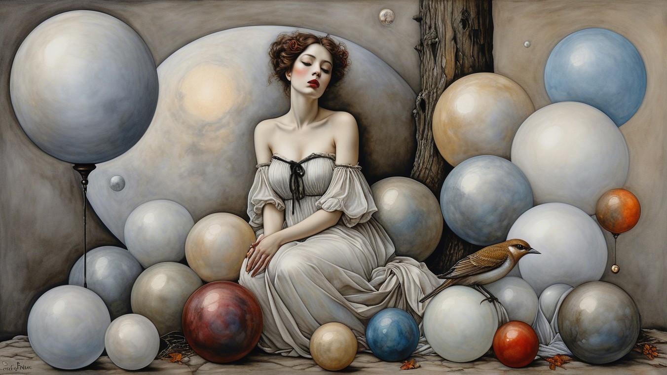 A woman with curly hair gazes thoughtfully at a colorful bird perched on her hand, surrounded by celestial orbs and artistic spheres, blending elements of nature and imagination.