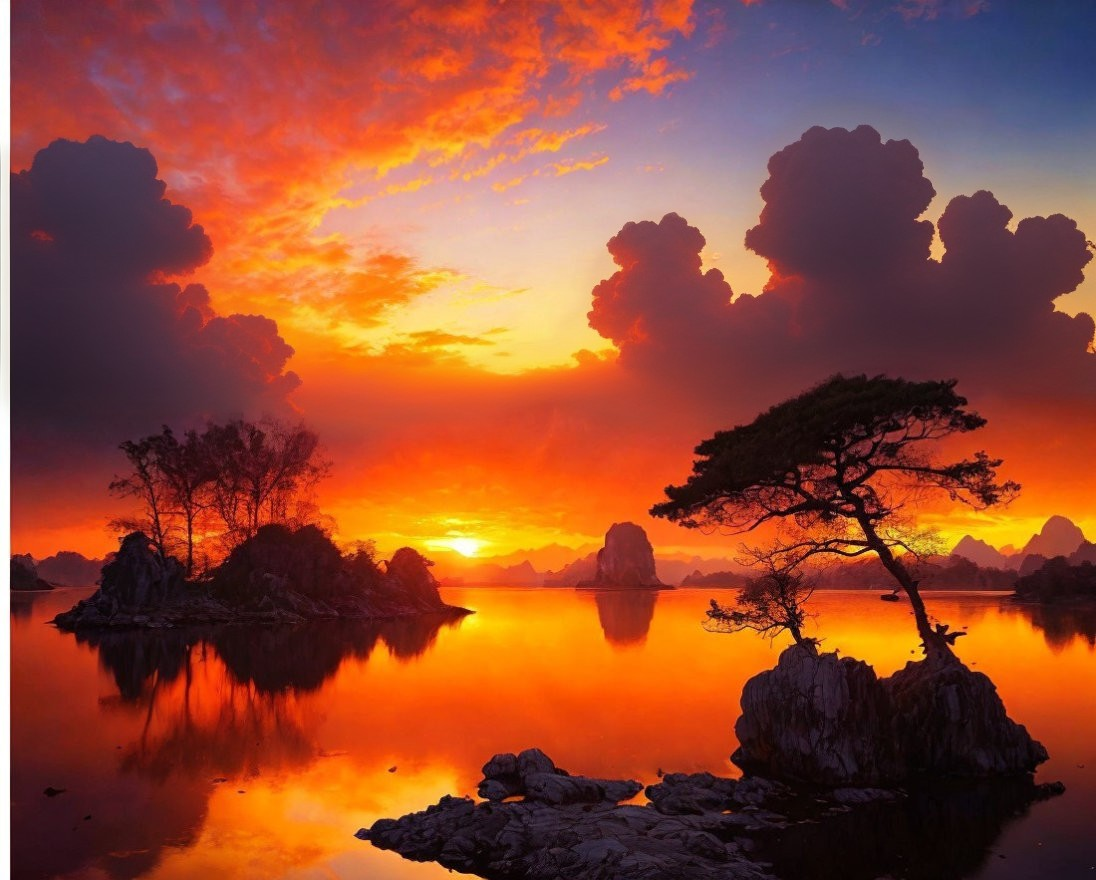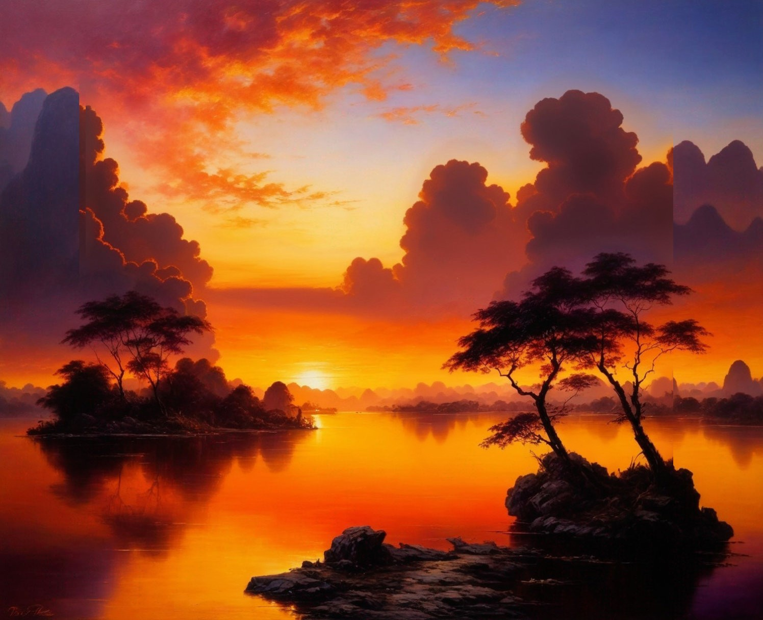 Prompt: "Oil on canvas, wide angle landscape view, a magnificent sunset at Yangshuo Karst Mountains. Glowing with vibrant hues, glowing with vibrant hues, sky transitioning from warm orange to deep purple. Perfect composition. By Peter Paul Rubens. William Turner."