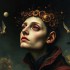 A striking portrait of a woman with intricate floral headwear. She gazes upward, surrounded by ethereal birds and roses, evoking a sense of wonder and mystery under a crescent moon.