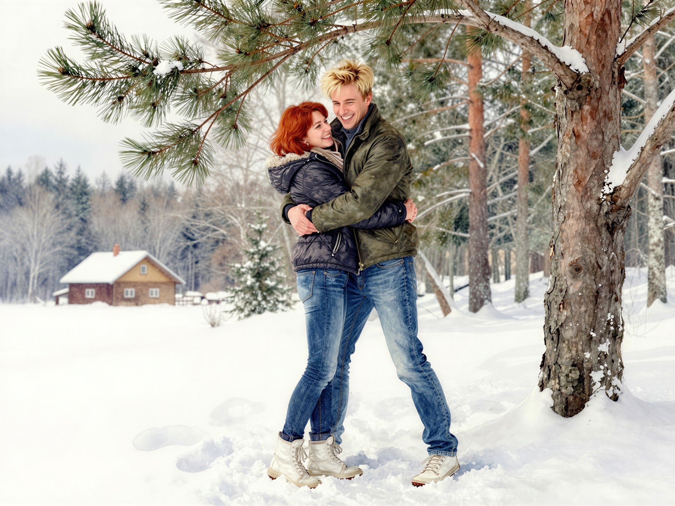 A young couple is happily posing outside in a snowy forest, with a snow-covered branch of a pine tree in the foreground. The man, with blonde hair, is wearing a green winter jacket, jeans, and light-colored shoes. The woman, with red hair, is wearing a dark blue