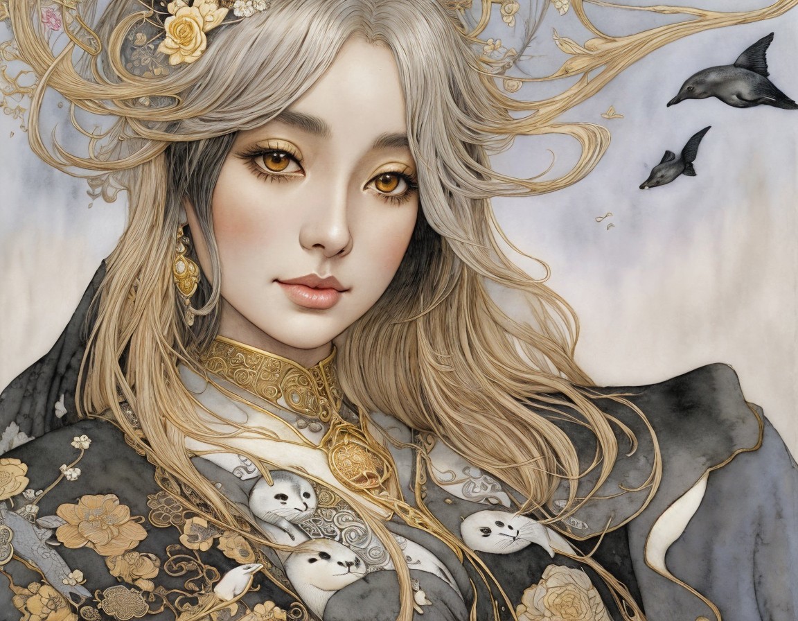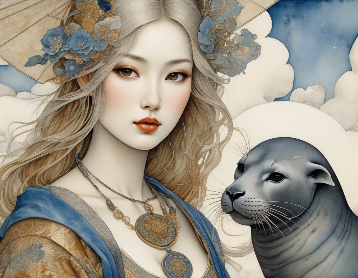 The beautiful woman with her seals. Medieval Japanese Artists Sumi-e Style, browns, cream, blues and greys, Velvet Black, Shabby, Dull Gold, Amber Gray, Golden Ratio, Surreal Fantasy, Elegant, High Definition Ultra Fine 3D Line, Zenangle Style, Watercolor Patchwork , Arthur Rackham Style, Paul Kidby, , Jacek yerka, Extremely Detailed, Intricate, Thoughtful, HDR, Fractal, Beautiful, Award Winning, Fantasy Look, Fantasy, Crisp Quality