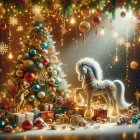 A festive scene featuring a beautifully decorated Christmas tree, adorned with colorful ornaments and lights, alongside a charming toy horse and a pile of wrapped gifts, all aglow with holiday spirit.