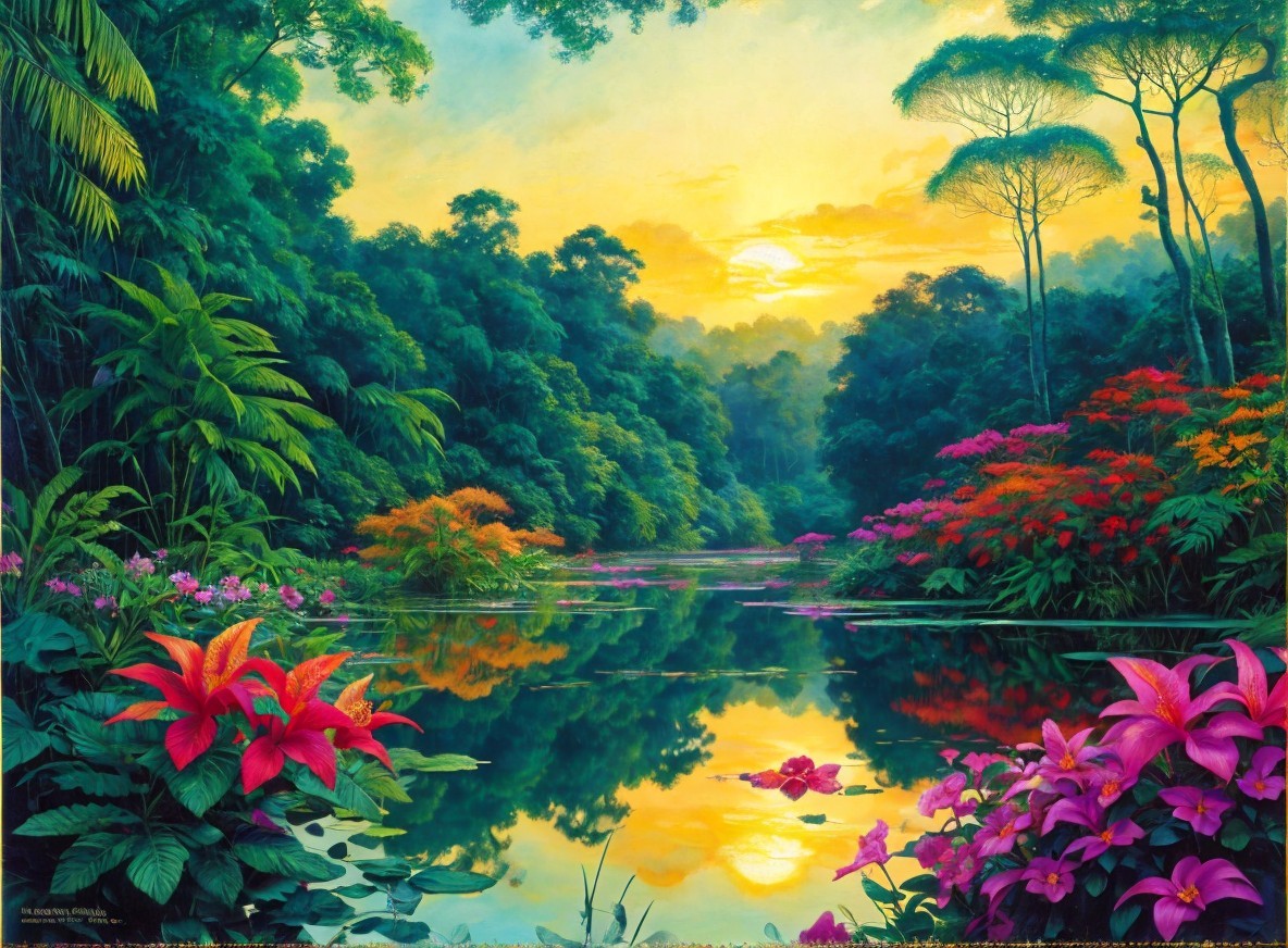 A vibrant landscape featuring a lush jungle at sunrise, reflecting colorful flowers and tropical foliage in calm waters. The warm glow of the sun enhances the vivid greens and pinks.