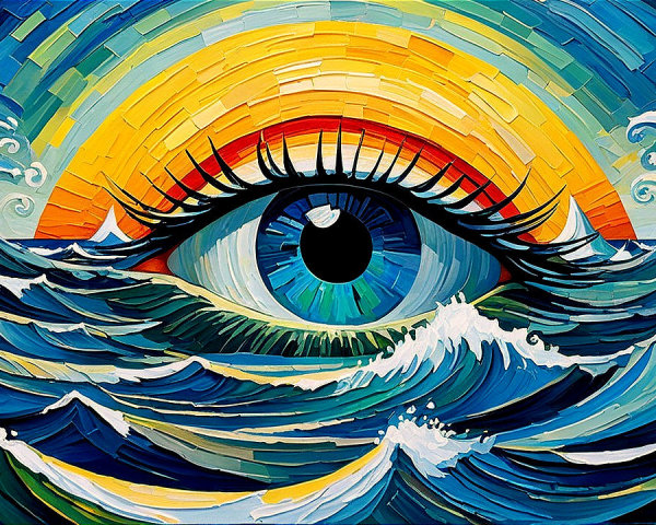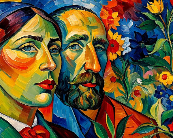 The image features a bearded man in a long coat standing amidst a vibrant landscape. Majestic mountains rise behind him, under a swirling sky painted in rich blues and golden sunset hues.