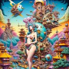 A young woman with voluminous curly hair stands against a vibrant landscape featuring mountains and ornate structures, under a dramatic sky filled with colorful clouds and a bright moon.