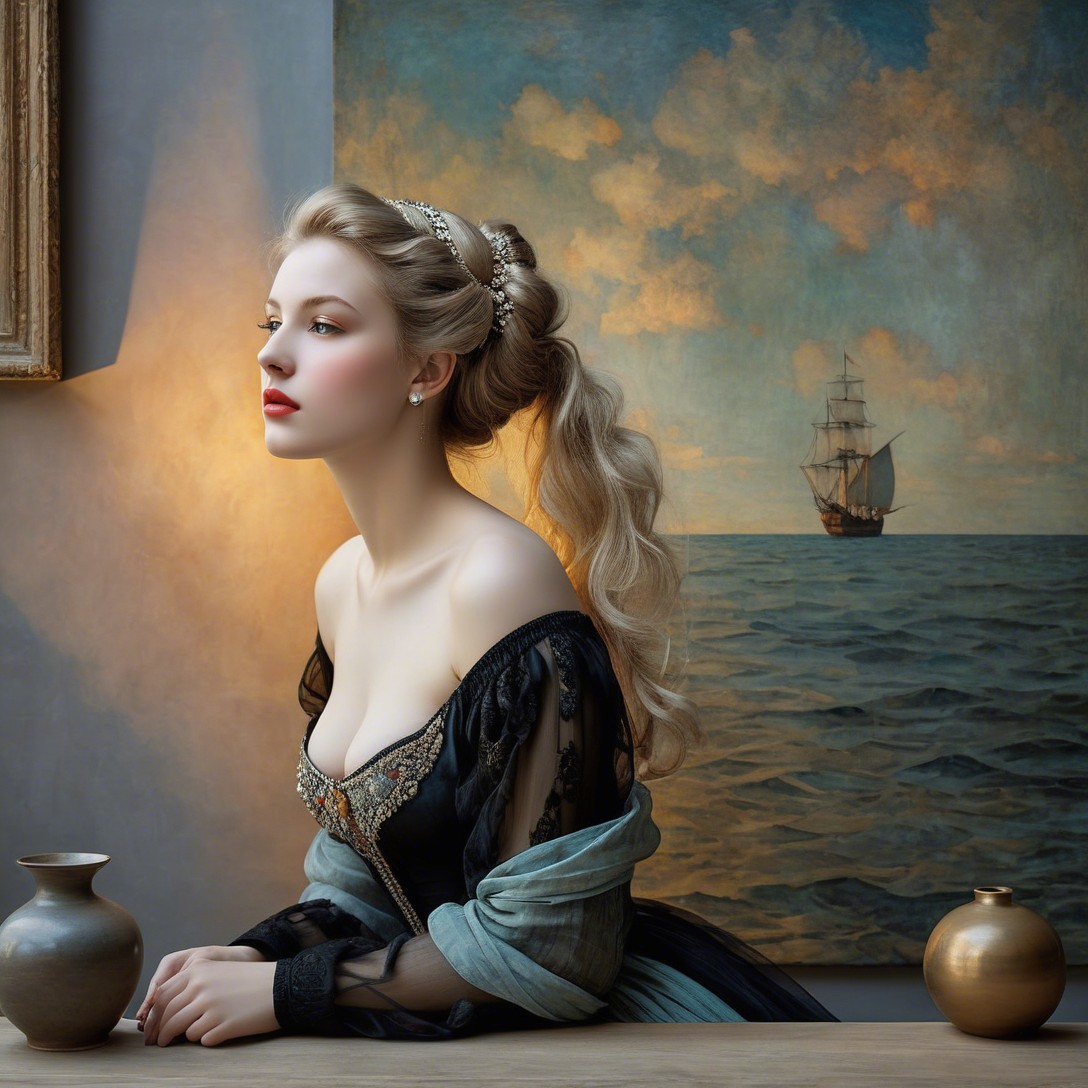 A young woman with fair skin, light blue eyes, and long, curly, golden blonde hair adorned with an elaborate headband featuring small pearls and white flowers. She gazes to the left with a pensive expression, her lips slightly parted. She is wearing an elegant off-the-shoulder dress with