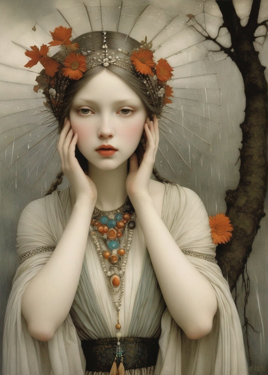 Pale woman in floral crown and vintage dress in misty forest portrait.