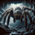 A detailed close-up of a large spider in a dark cave setting. Its hairy body and prominent eyes create a striking image, surrounded by rocky textures and soft, dim light.