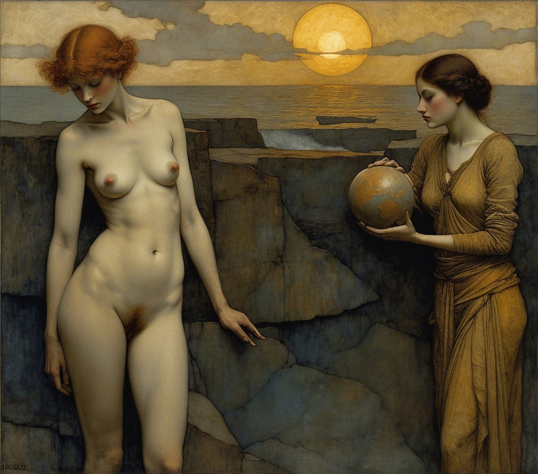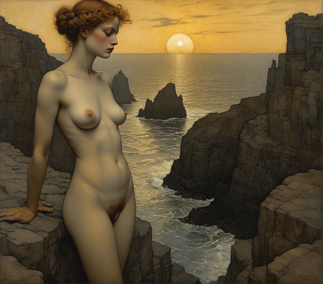 A serene scene depicting a woman in a flowing golden gown, standing on rocky cliffs overlooking a tranquil ocean at sunset, with soft waves reflecting the warm hues of the sky.