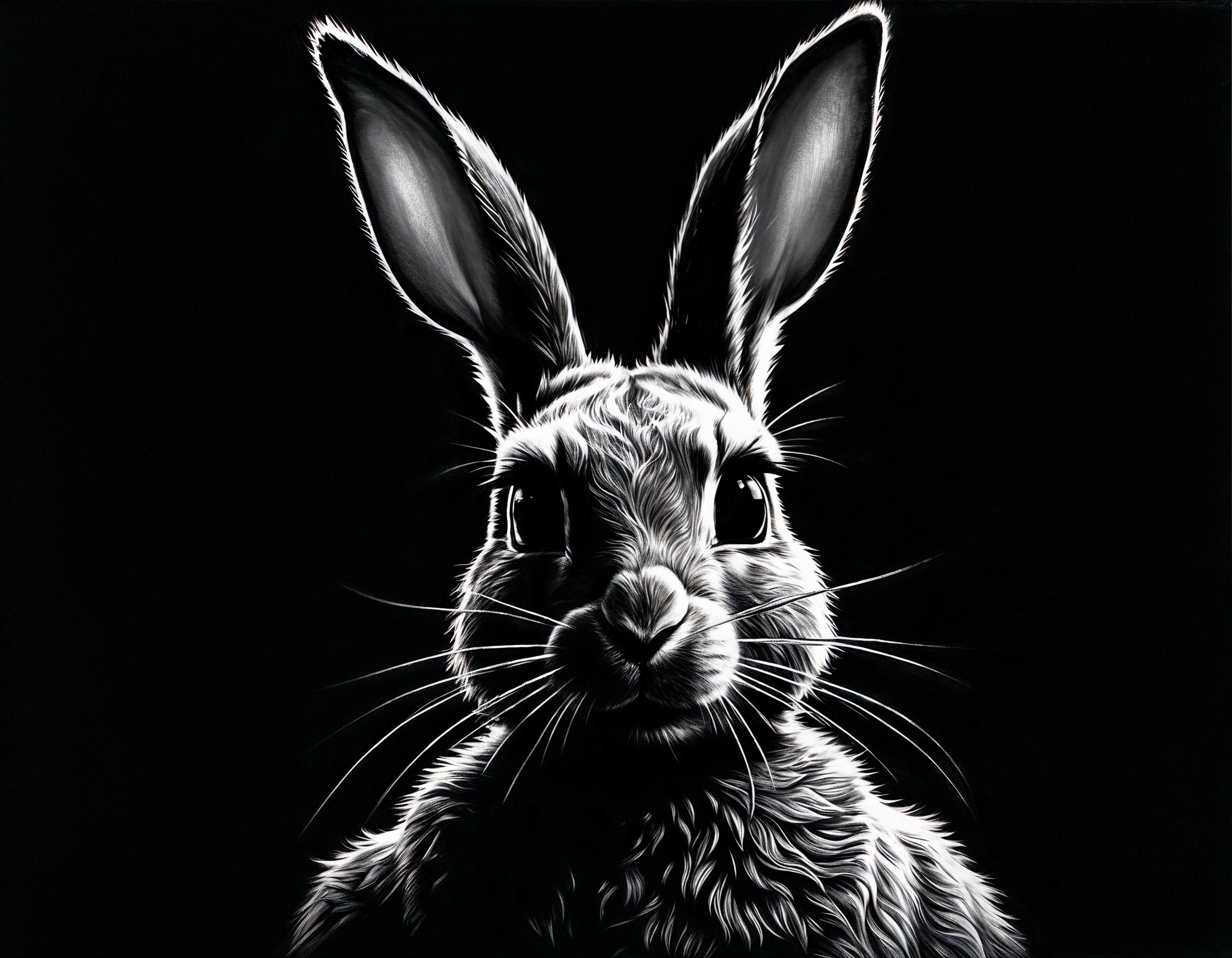A striking black and white illustration of a rabbit, featuring large ears and expressive eyes, set against a dark background. The texture emphasizes its fluffy fur and soulful gaze.