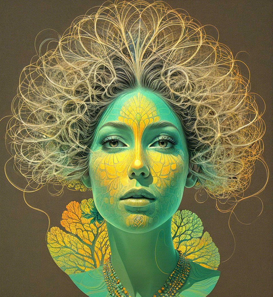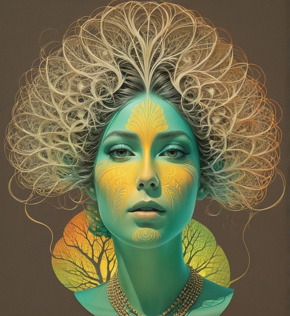 Simplistic portrait, stylized, fractals and cymatics in hairdo, bright lighting, catenaries and hues by Overton Loyd, filigree neuronal network motifs, 1970's fantasy meets surrealism, immerse intricate delicate paper fibers and subtle paint linework, styled by Man Ray and Simon Stålenhag, bright, warm tones, fantasy style of Dee Nickerson, ultra detailed, comical inkpunk twist, mesmerizing splash ink technique reminiscent of Georges Seurat, blending aquatint with aquarelle extrusion & thinned watercolor effects, intricate shimmering patterns, surrealism by Gayane Khachaturian, ambient occlusion 1.3, 128k rendering, dyed, parallax occlusion 1.3, raytraced shadows 1.3, dynamic lighting 1.3, metallic-honey accents, wavery dappled lighting, zentangle, rim lighting, otherworldly ambiance, mosaic with hatching influences, color hues by Overton Loyd and Ho baron, sculpted, flowing hair illusion, ethereal atmosphere, cel-shaded drawing style, novelty architecture, dof, bokeh, debeh, negative lucas numbers, detailed line-art with geometrical precision,intricate lineage, precise Gelsculpt 64K,american gothic 1.7, dimmed lighting, rule of thirds, panavision, weathered, dyed, tiny lines, low key lighting, divisionism, quilling, delicate coloring 1.3, sculpted, cel-shaded, Arcane GTNR style, novelty architecture, merged styles of Ed Binkley, William Turner, Arlie Opal, Stan Lee, Alphonse Mucha, stylized Patchwork, overall composition by Rufus Dayglo, hues, dyed, action painting reminiscence, simplistic,