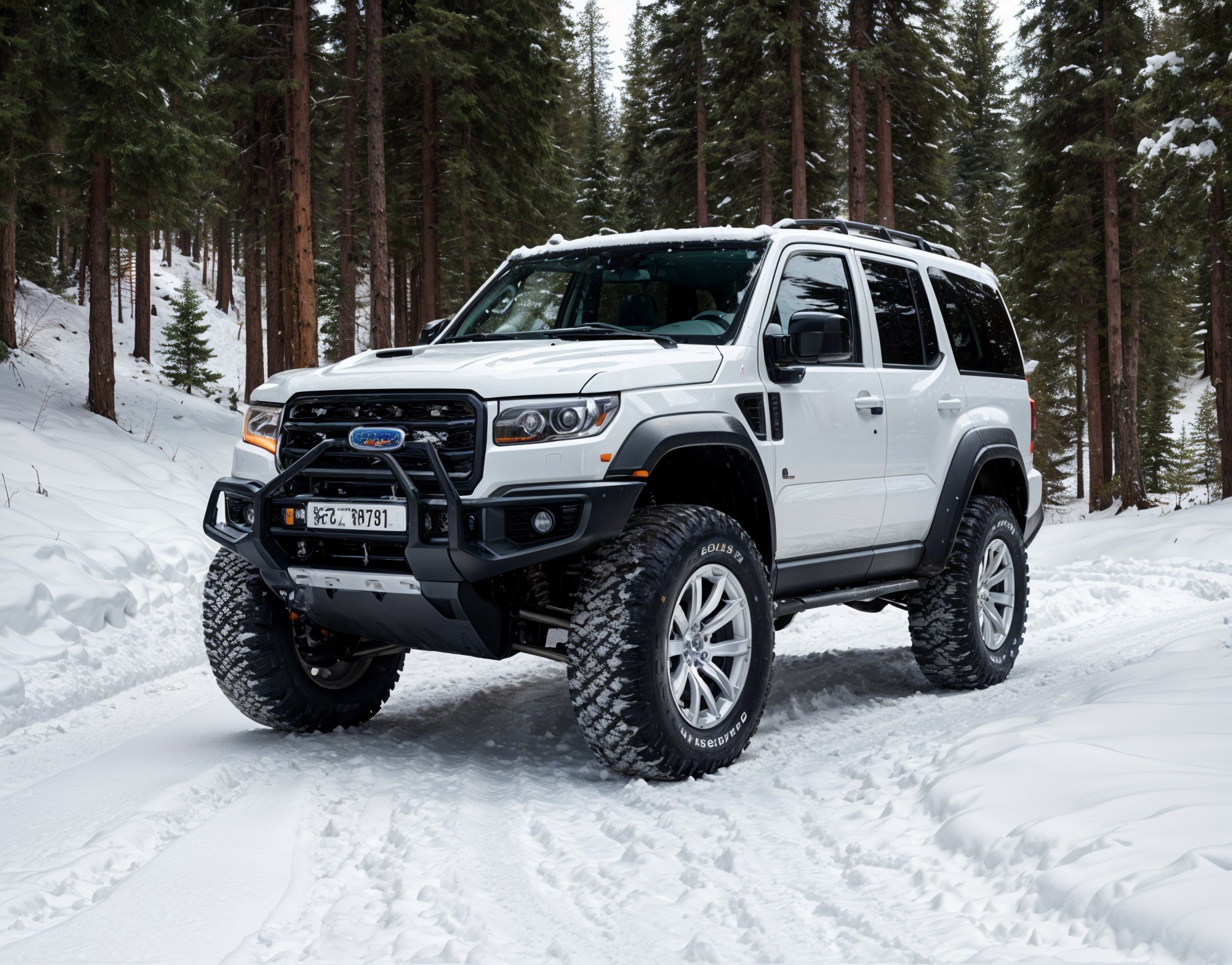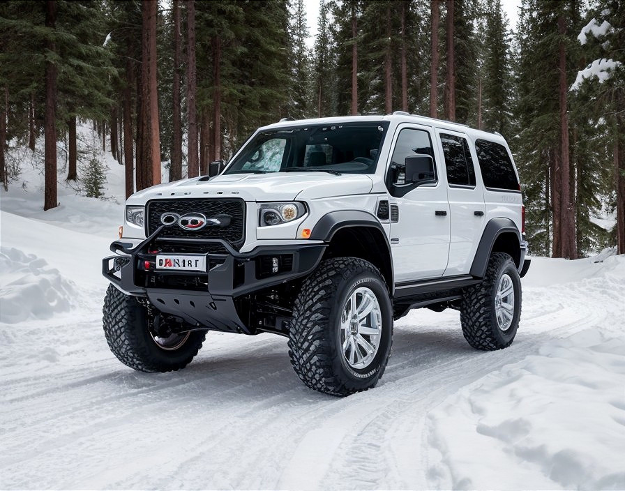 A rugged white SUV with large off-road tires navigates a snowy forest landscape, showcasing its robust design and capability for adventurous driving in winter conditions.