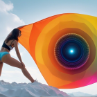 Woman in Sandy Landscape with Flowing Vibrant Fabric