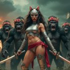 Fierce warrior in silver armor with gorillas behind