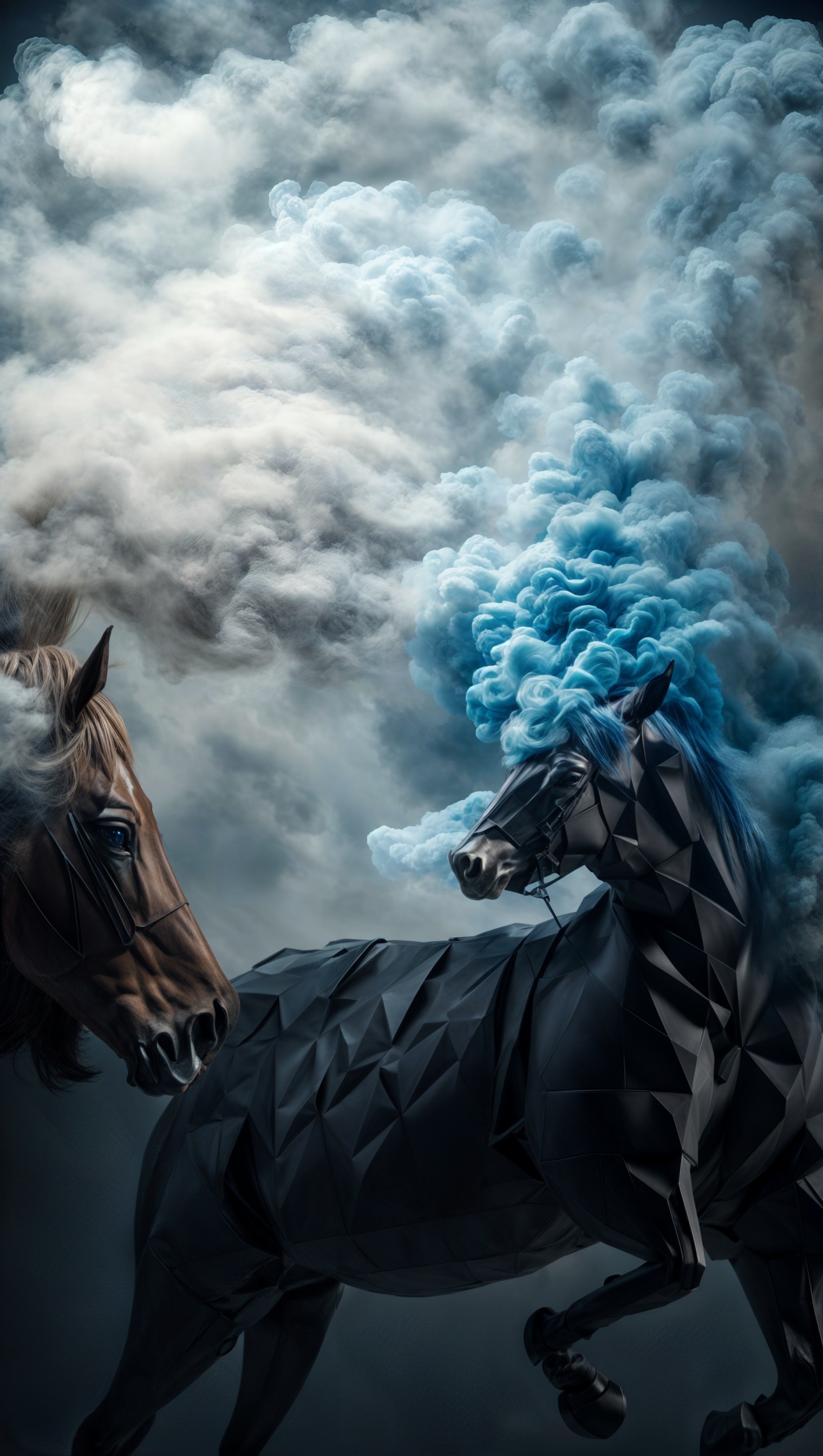 Two horses with stylized polygonal body patterns appear amidst swirling blue smoke.