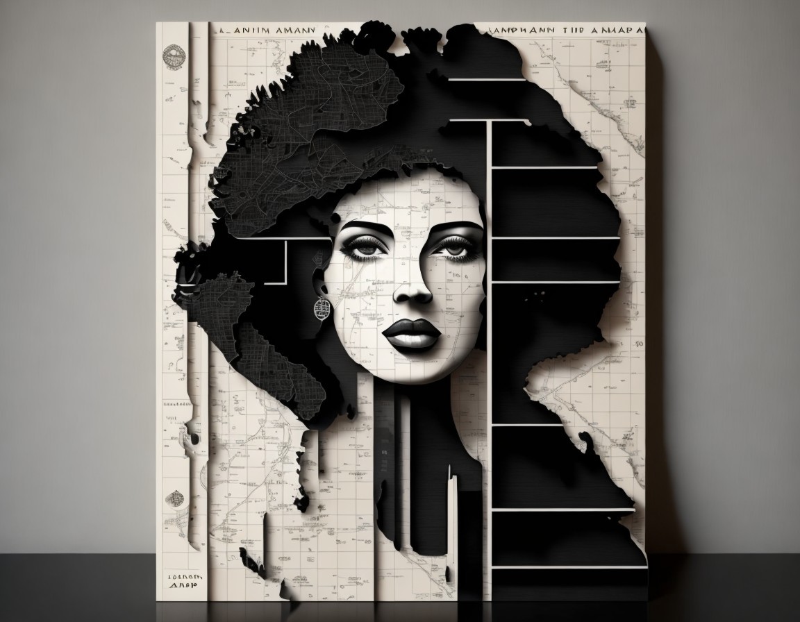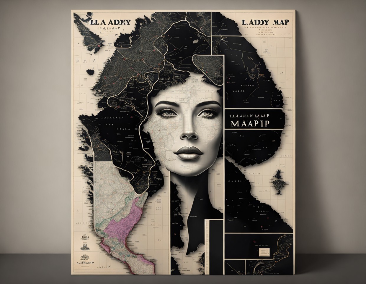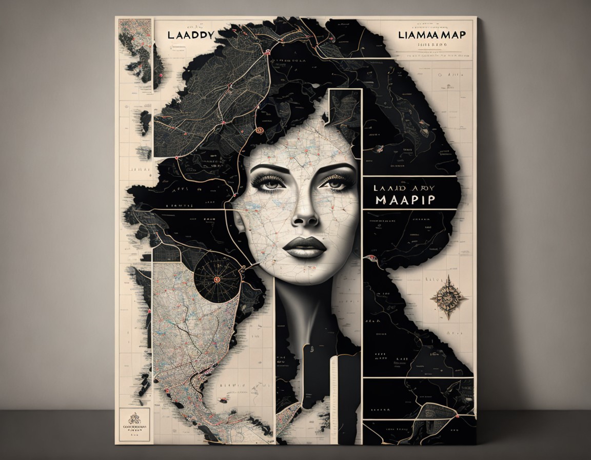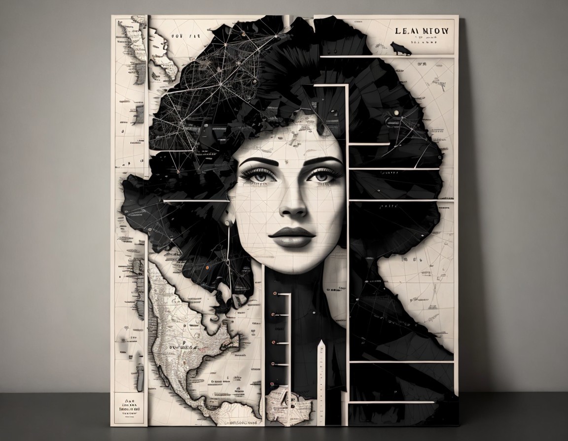 Intricate vintage-style map canvas blending seamlessly with a woman's face