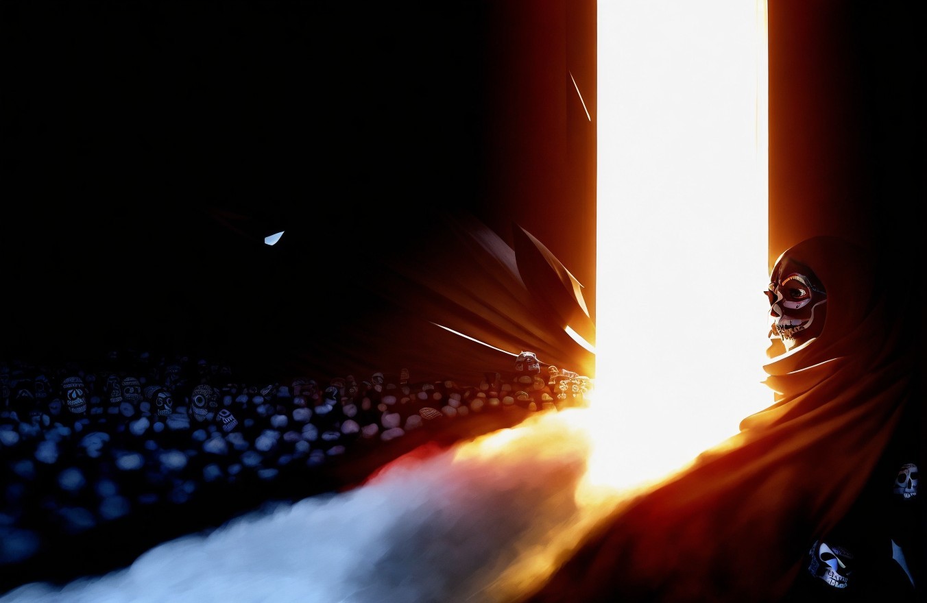 + Prompt:A monochrome image featuring a stylized figure in the center wearing a wide-brimmed hat and a high-necked cloak with prominent folds. The figure has a skeletal face painted or masked to resemble the calavera makeup associated with the Mexican Day of the Dead, complete with intricate designs around the eyes, over the bridge of the nose, and on the chin, as well as vertical lines on the lips to simulate teeth in a skull's grin.