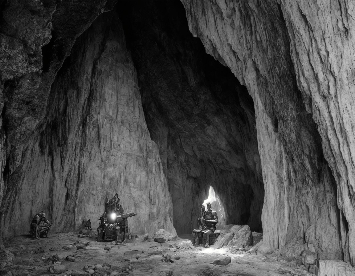 A knight, a robot, and a creature rest in a cave, with a small creature standing watch.