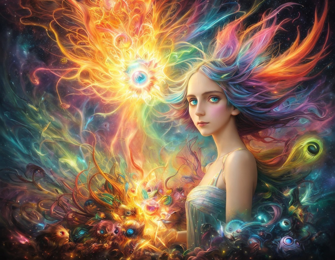 Fantasy Illustration of Woman with Fiery Hair and Cosmos