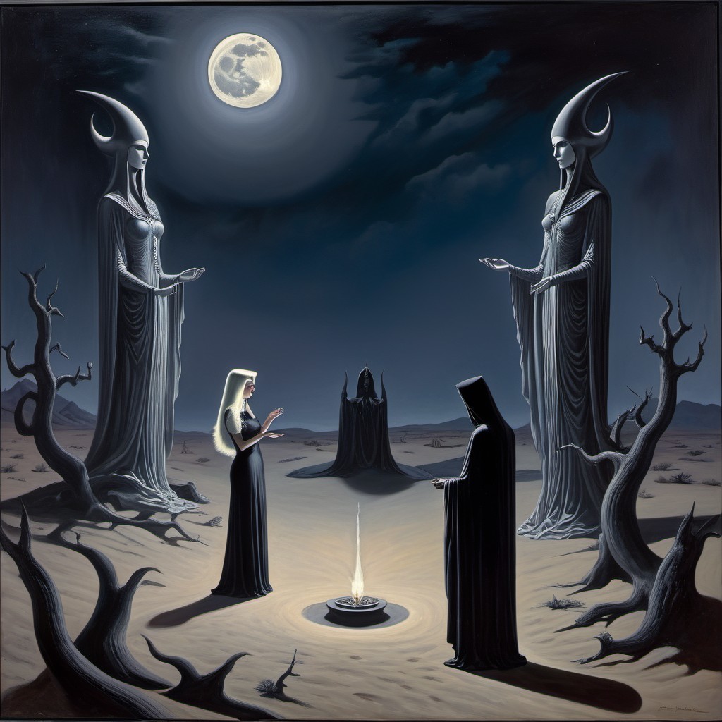 Cloaked Figures and Ethereal Woman in Moonlit Desert
