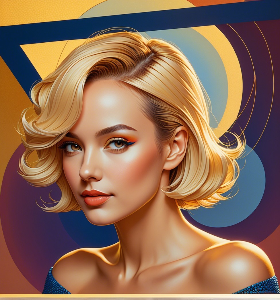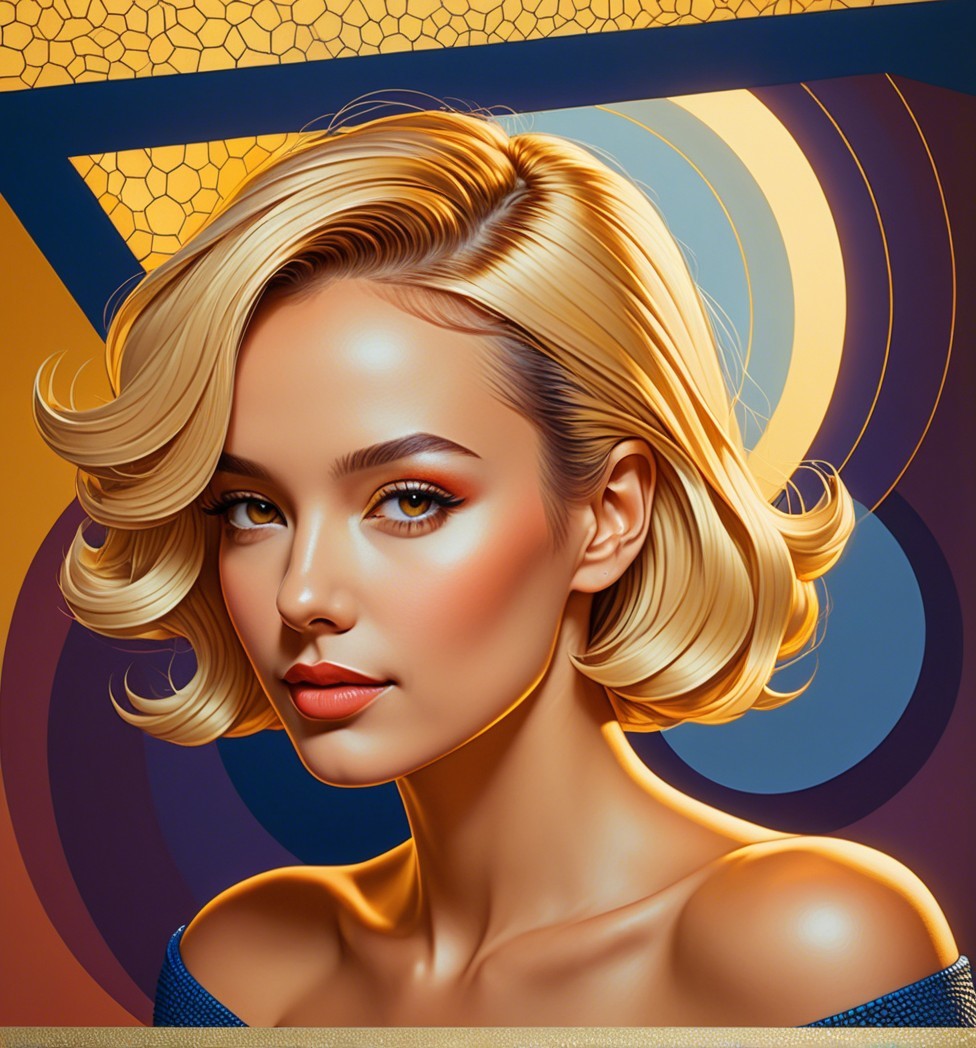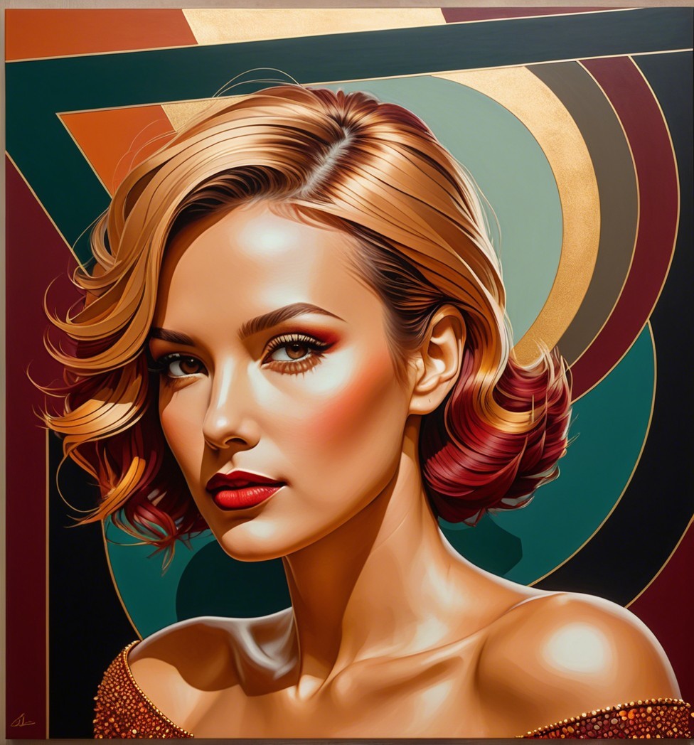 The image features a stylized portrait of a woman with glamorous, wavy hair in shades of blonde and burgundy. She has striking features and a confident expression against a geometric background.
