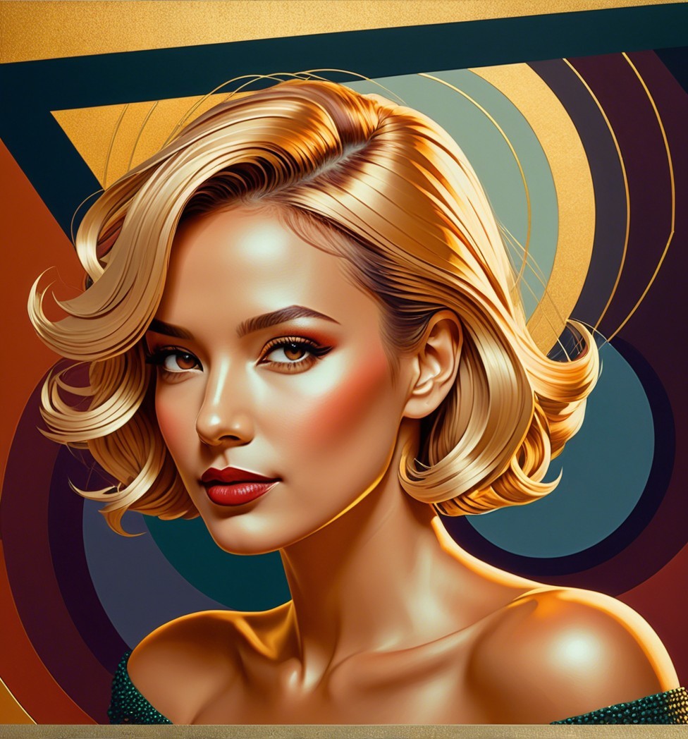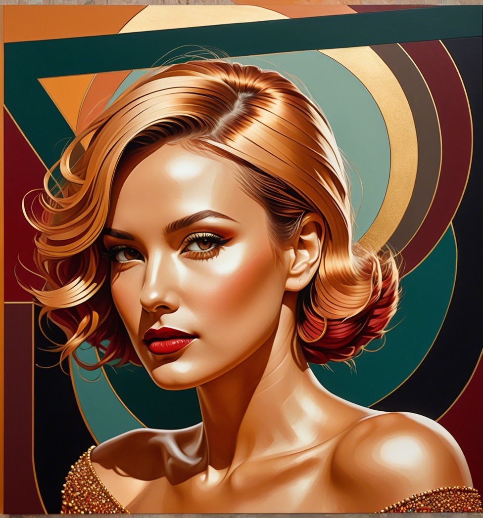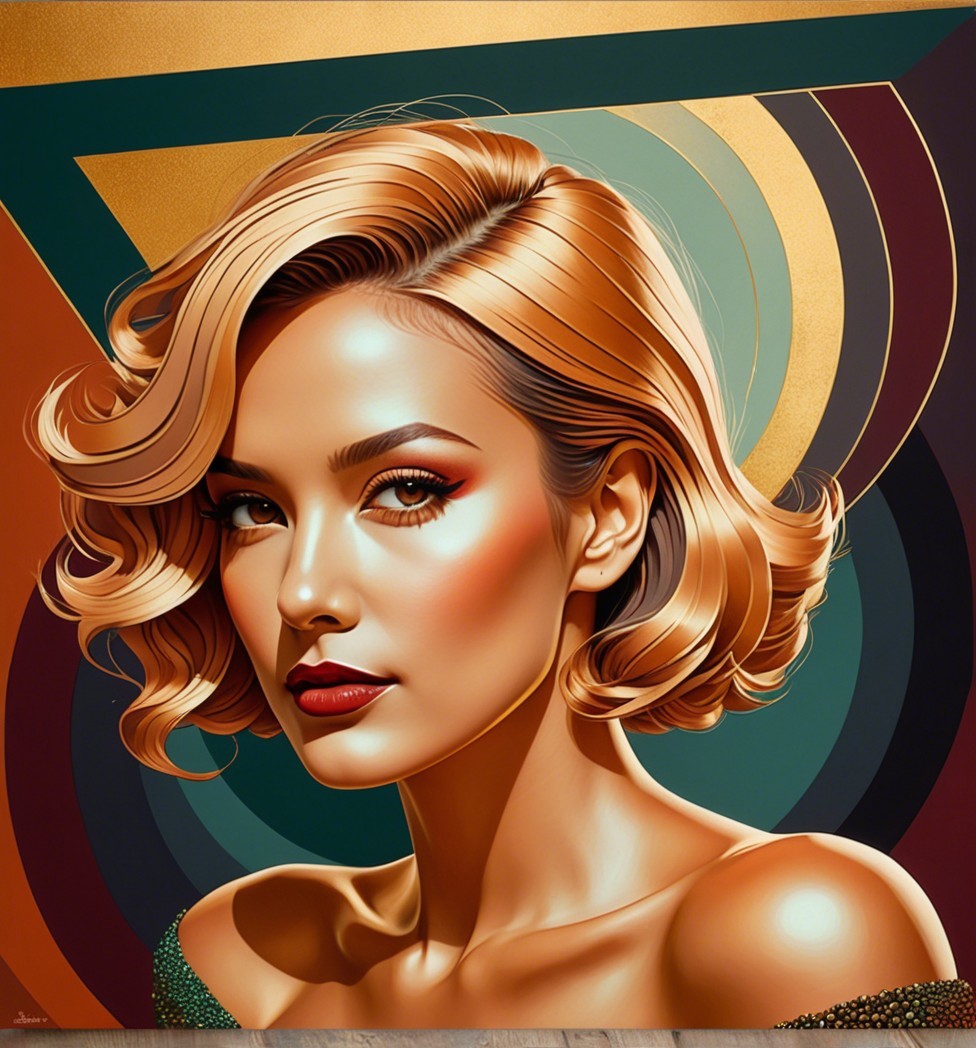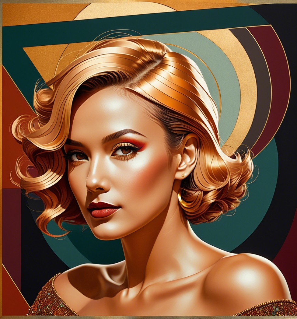 The image features a stylized portrait of a woman with glamorous, wavy hair in shades of blonde and burgundy. She has striking features and a confident expression against a geometric background.