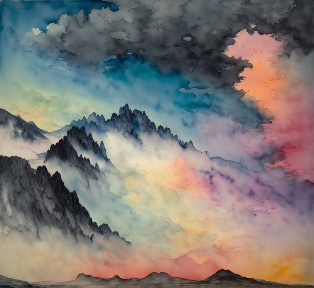 + Prompt:watery landscape, seen through close mountains, dramatic surreal pencil sketched sky, strong distinct photo-like foreground, very strong outlines, over-saturated colors, Kim Keever, Thom, (champlevé) watercolor, pastel, ink, arthur rackham, monet, Crivelli, Vallotton, Edward Atkinson Hornel, John Hoyland, watercolor, pastel, ink painting rendered in plique-à-jour technique, style of Andy Kehoe...