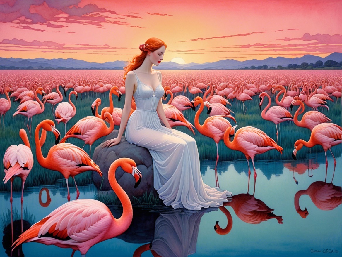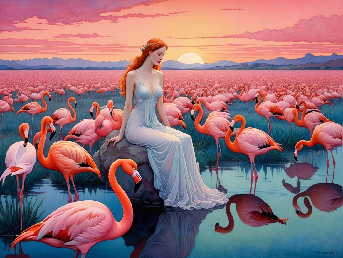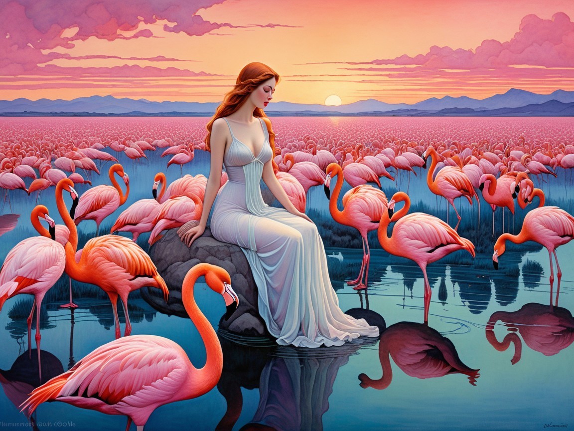 A serene scene featuring a woman in a flowing blue dress sitting on a rock among vibrant pink flamingos. The backdrop includes a tranquil sunset and lush, flowering mountains.