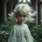 A young girl with flowing silver hair stands amidst lush greenery, wearing a delicate white dress adorned with flowers. She gazes intently, capturing a sense of ethereal beauty and mystery.