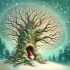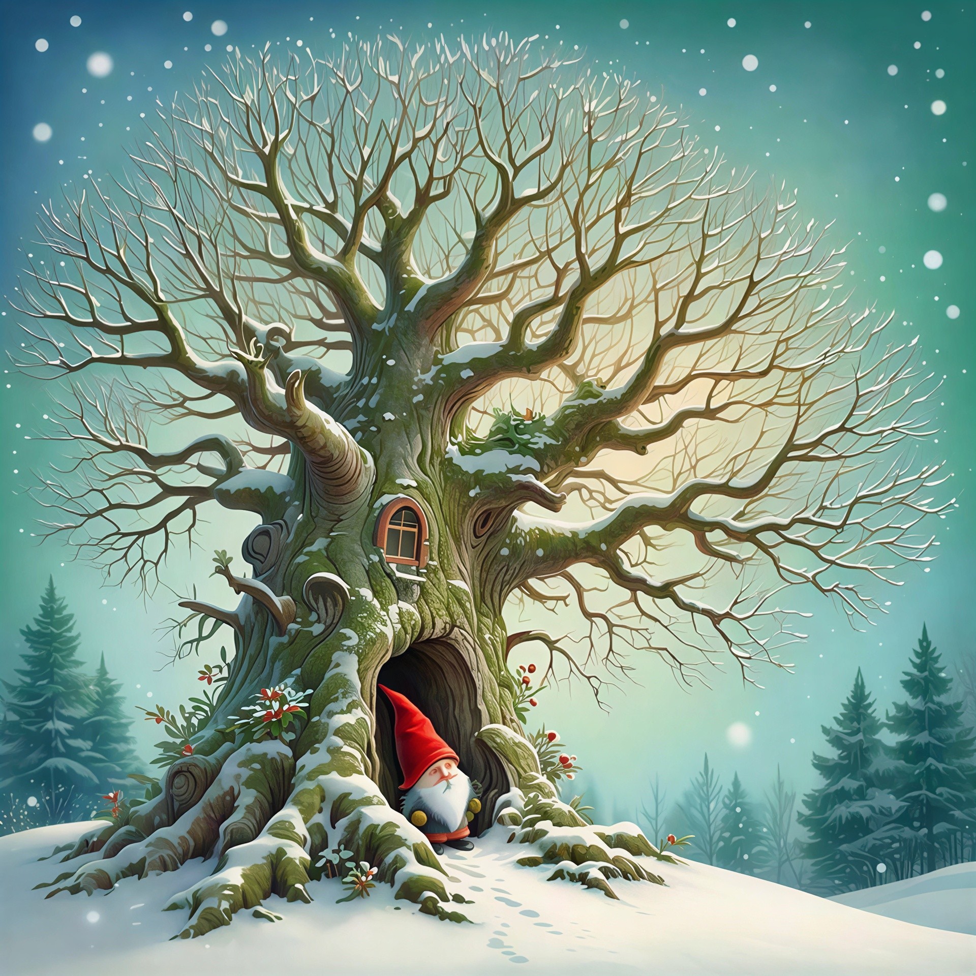 A cozy winter wonderland scene featuring a large, ancient tree with snow-covered branches and roots. A whimsical gnome with a red hat and white beard is peeking out from a hollow in the tree's base, which serves as a charming home with a small window. Snow is gently falling, and
