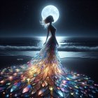 A serene beach scene features a figure in a stunning, iridescent gown that transitions from deep blue to vibrant rainbow hues, reflecting the glimmering stars and moonlight above.