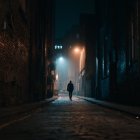 In a dimly lit urban alley, a lone figure stands surrounded by towering buildings. Soft orange and blue lights illuminate the misty scene, creating a mysterious, atmospheric vibe.