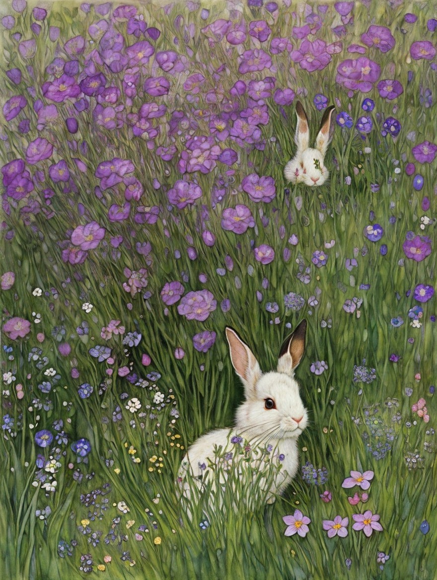 A woman in a white dress sits amidst blooming flowers with a basket of colorful eggs, accompanied by a white rabbit.