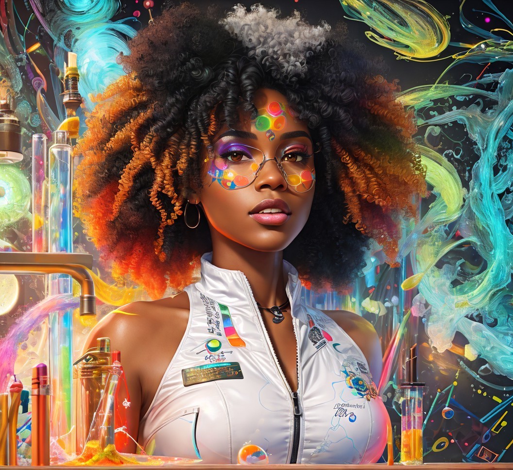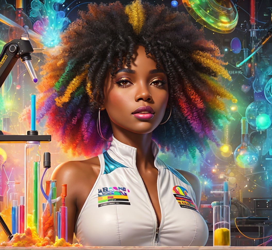 Prompt: Extremely detailed, 2d digital painting, black woman in a bodysuit in a science lab, afro, blended colors, colorful, dark color palette, gradation, striking detailed art style, outline, no text, loose brush strokes