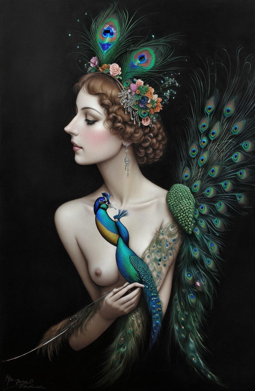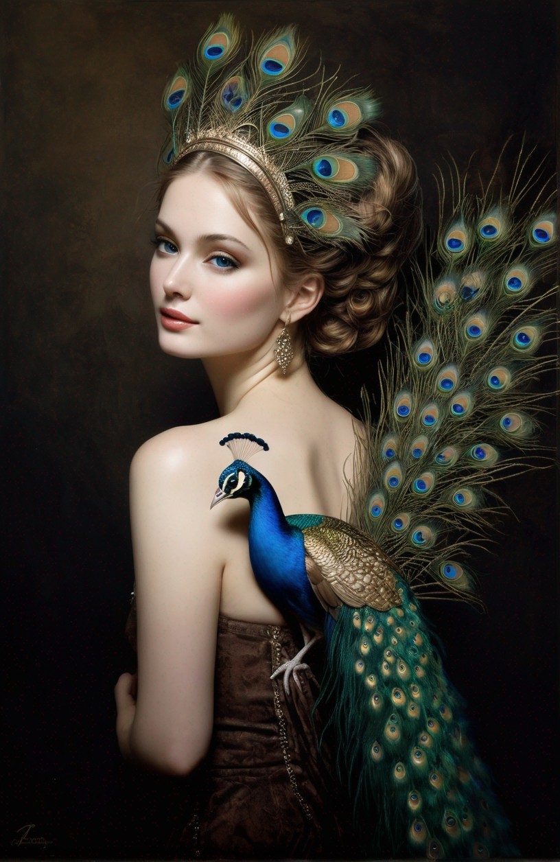 A woman in regal attire with a peacock, showcasing elegance and sophistication.